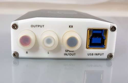 На задней панели расположены: линейный выход 2 хRCA, совмещенный SPDIF вход (коаксиальный RCA/оптический 3,5 мм), и цифровой USB вход для подключения устройства к ПК и соединения с адаптером питания.