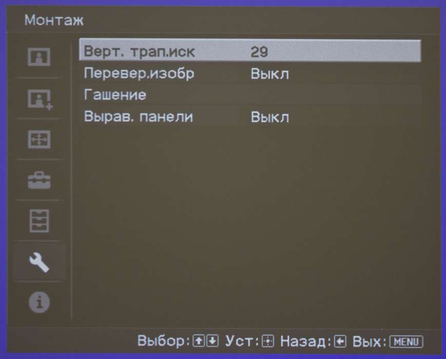 Еще кое-что для проекции обнаружилось в меню «Монтаж». Здесь можно выправить вертикальное искажение трапеции и перевернуть изображение: вниз головой, если проектор приделают к потолку, или зеркально, если кино польется с той стороны полупрозрачного экрана.