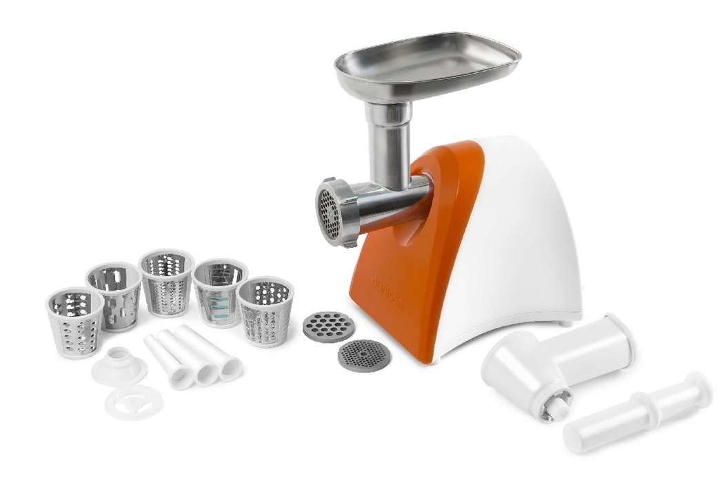 Компания OURSSON представила на российском рынке очень необычную мясорубку: компактную, многофункциональную и почти бесшумную. Приборы с настолько низким уровнем шума до сих пор являются большой редкостью. Помимо трех дисков для мяса разного диаметра, мясорубка комплектуется тремя насадками для приготовления колбасок — большой, средней и малой. Насадки для шинковки и терки, в том числе редко встречающаяся специальная насадка для натирания твердого пармезана, помогут разнообразить меню и сэкономят время и силы. Реверс в случае необходимости проворачивает шнек назад и помогает достать застрявшие кусочки. Прибор рассчитан на работу с мясом разной жесткости.