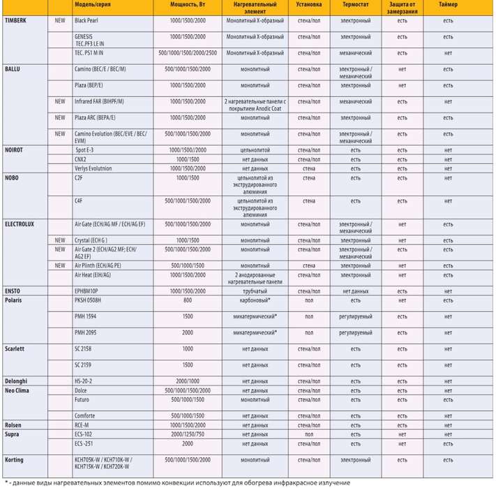 Таблица характеристик наиболее популярных и недавно поступивших в продажу электрических конвекторов.