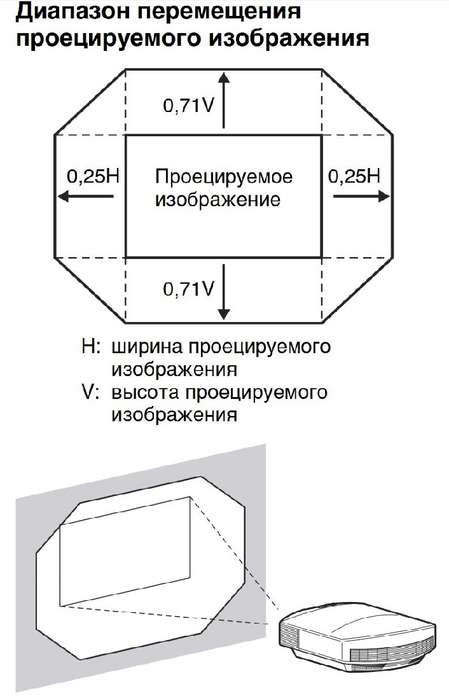 Сдвиг объектива по горизонтали возможен на +/- 25 процентов от ширины проецируемого изображения, а по вертикали — на 71 процентов, что заметно упрощает установку проектора на потолок. При этом необходимо помнить, что невозможно одновременно использовать максимальные положения сдвигов.