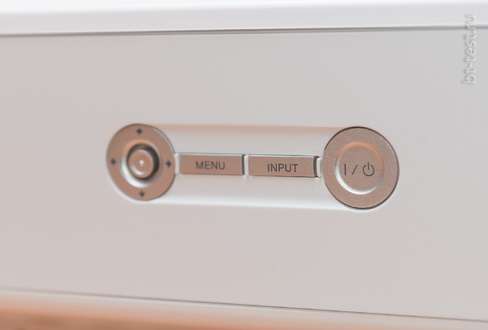 По середине белой боковины расположены органы управления, включающие в себя кнопку включения, кнопку меню и выбора источника, а также навигационную кнопку (селектор). Строго, скромно и со вкусом. Ничего лишнего.