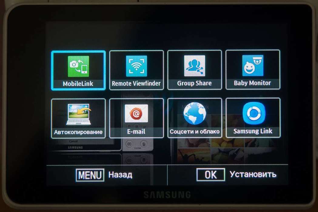 Все беспроводные функции сгруппированы в подменю Wi-Fi, которое вызывается одноименной кнопкой из меню режимов и выводит на экран восемь пиктограмм с названиями доступных функций. Для работы большинства из них требуется предварительно установить на смартфон или планшет бесплатное приложение Samsung Smart Camera.