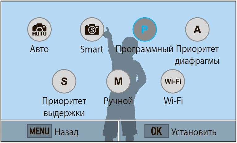 Войти в один из так называемых творческих режимов (P/A/S/M) можно еще быстрее: после нажатия кнопки Mode просто тыкаем в экранную кнопку нужного режима. Кстати, в меню режимов также имеется кнопка c маркировкой Wi-Fi. Она открывает подменю из восьми функций, связанных с беспроводной связью. Но о них мы расскажем в отдельной главке.