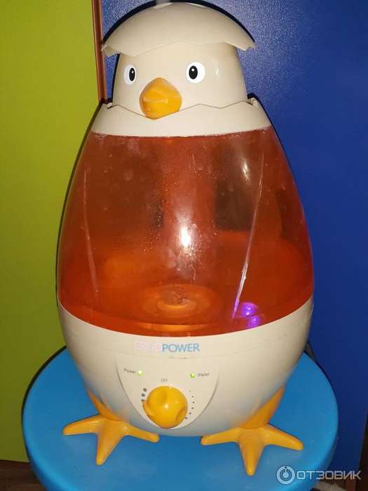 Оригинальный ультразвуковой увлажнитель компании Ergopower ER-HQ 605 представляет собой яйцо, из которого вылупляется веселый птенец. Благодаря подобному решению удалось совместить забавное с серьезным: объем емкости для воды достигает рекордных 4,5 литра. Часть корпуса выполнена из полупрозрачного пластика оранжевого цвета, что позволяет контролировать количество воды. Управление стандартное – механическое.
