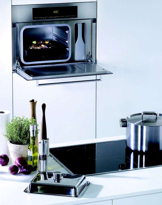 К ставшим уже привычными пароваркам домино со стальной ванночкой (как Gaggenau VK 230) добавились новые приборы со стеклокерамической конфоркой в виде невысокой «кастрюльки» (Kuppersbusch EMG 457.1 M), предназначенной не только для пропаривания, но и для жарки, тушения, грили-рования, в том числе без использования посуды.