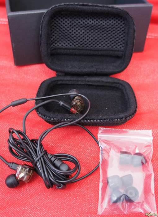 Наушники поставляются в картонной коробке с симпатичной цветной полиграфией. Внутри находятся наушники, чехол для хранения и переноски IM01, комплект из трех силиконовых насадок размеров S/M/L, одной парой пенных насадок и сменным кабелем с L-образным джеком 3,5.