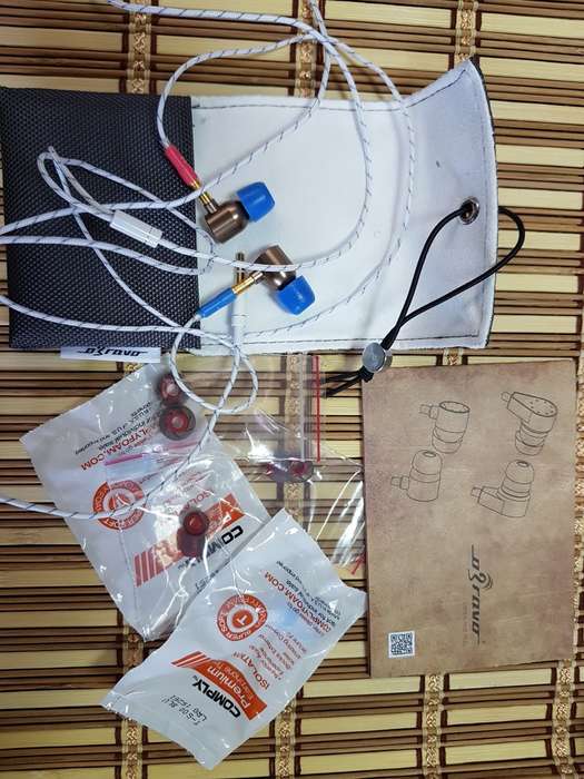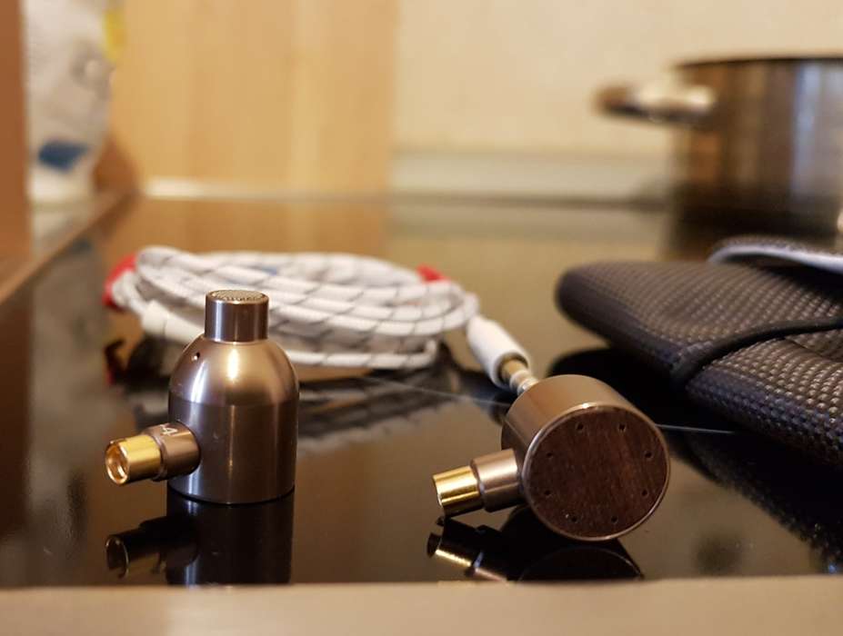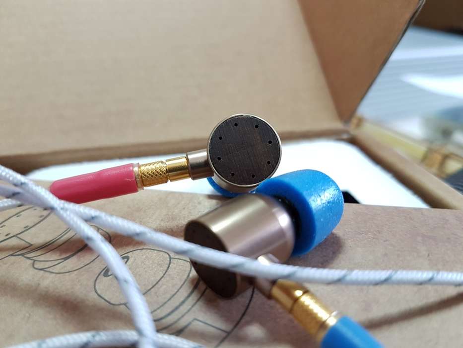Наушники имеют брутальный «пулевой» дизайн, выглядят притягательно, эдакий «хэнд-мейд». Сборка крепкая, материал - алюминий с бронзовым отблеском, задняя «крышка» - из дерева, со следами от «иголок» по окружности. Кабель очень мягкий, белого цвета, jack 3,5 мм. Разъемы MMCX на кабеле имеют замок/ключ и соединяются с наушником с характерным щелчком. Из насадок я выбрал «пену» среднего размера, пока не колдовал с чужим силиконом, а родной мне не очень подошел. К тому же звучание с пенными насадками мне показалось наполненным и основательным.