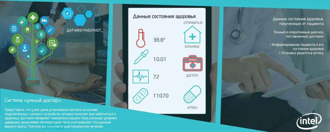 Забота о здоровье. Комплект «умных» устройств, установленных у вас дома, может полностью преобразить ваш привычный процесс заботы о здоровье. С помощью «умных» весов вы сможете контролировать ваш вес, а «умный» туалет будет выполнять анализ ваших продуктов жизнедеятельности. Датчики, установленные в этих устройствах и в вашей одежде, будут регулярно проверять ваше состояние и отправлять данные непосредственно вашему доктору. При профилактическом посещении врач будет иметь информацию обо всех показателях вашего тела, что позволит поставить более точный диагноз. Ваш лечащий врач сможет выписать вам лекарства в соответствии с вашими противопоказаниями. Поэтому вы всегда сможете получать оперативное и адаптированное лечение.