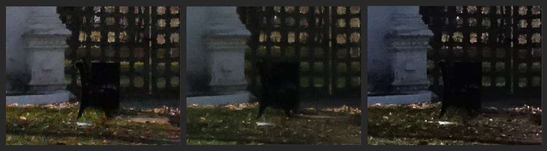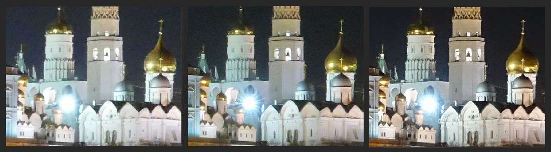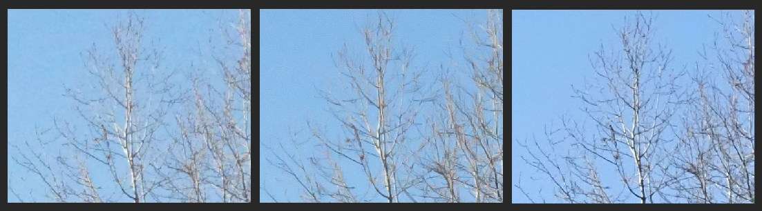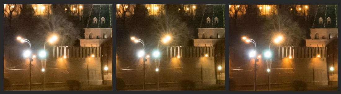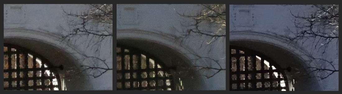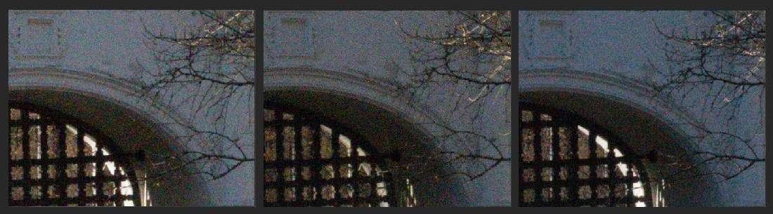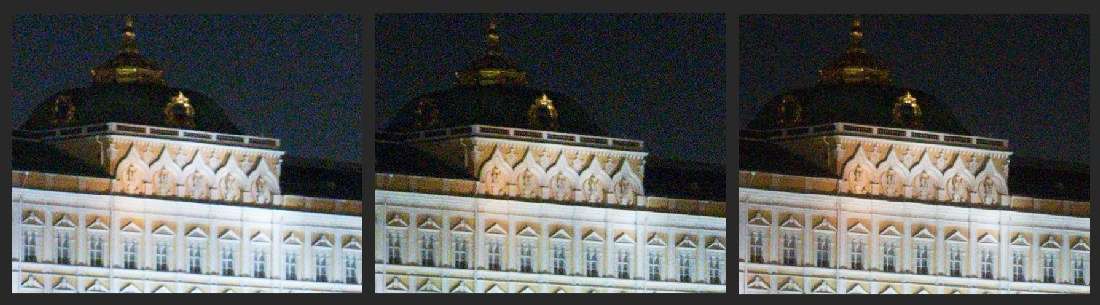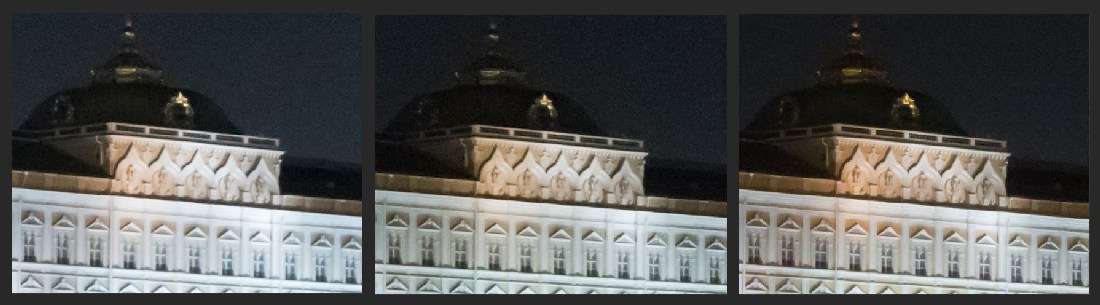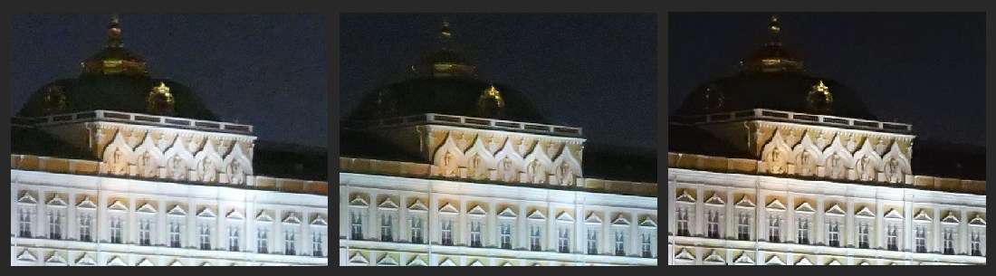 Для сравнения были взяты дневные и ночные тестовые снимки, записанные в форматах RAW и JPG, а также изображения, полученные при конвертации RAW-версий в программе Adobe Camera RAW с применением функции шумоподавления (для яркостной и цветовой составляющих цифрового шума). Из снимков-образцов были вырезаны по три характерных фрагмента, которые лучше всего раскрывают характер картинки, получаемой каждой из камер. Для удобства сравнения сэмплы объединены в полоски, где порядок следования камер постоянен: Panasonic Lumix DMC-FZ1000, Canon PowerShot G7 X и Sony Cyber-Shot DSC-RX100 M3.