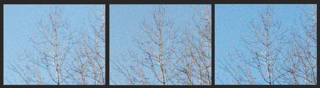 При самостоятельной конвертации RAW-файлов в таком распространенном конвертере, как Adobe Camera RAW, с помощью умеренных настроек шумоподавления удается получить изображения без описанных выше дефектов, правда, картинка в целом останется более зернистой, и достичь такой же гладкости равномерных участков (небо, глубокие тени) без дополнительной обработки не получится.
