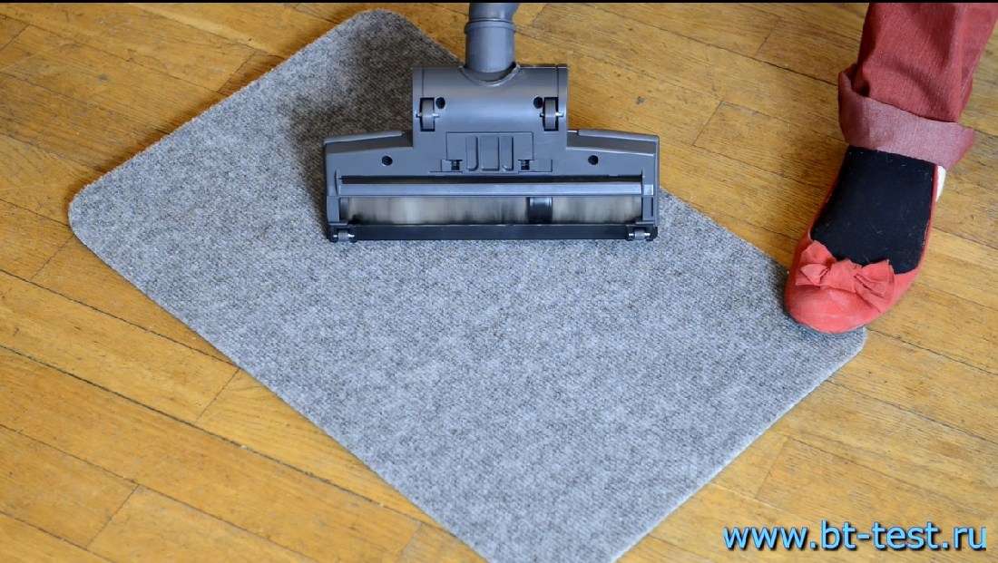Мы проводили тест с довольно колючим придверным ковриком, он обладает какой-то удивительной способностью сцепления с грязью. На нем разложили, а потом еще втоптали шерсть двух ужасно пушистых животных — норвежского лесного кота и собаки-лайки. Турбощетка справилась не просто хорошо, а блестяще. Мы не смогли ни к чему придраться.