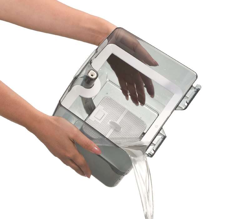 Корпус открывается нажатием на удобную крупную клавишу, аквабокс вытаскивается за ручку. В-третьих, есть возможность вертикально запарковать трубку на корпусе, вставляете ее в специальный паз — и готово: трубка не будет валяться на полу, если необходимо сделать паузу в уборке.