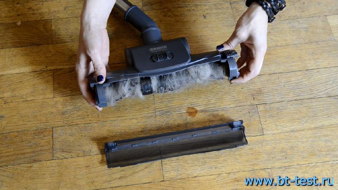 Валик турбощетки сделан так, что он не только хорошо наматывает шерсть и волосы, но и легко чистится: щетинки расположены достаточно свободно. Единственный минус — он не вынимается полностью, но, может, с таким расположением щетины это и не нужно. Кроме того, у турбощетки снимается прозрачная крышка, поэтому валик легко чистить, не вытаскивая его из корпуса.