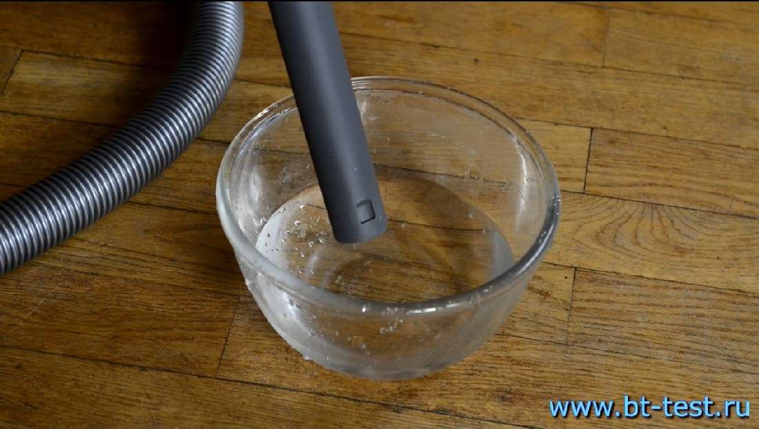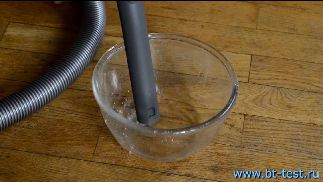 Тоже занимает секунды. Модель может справиться с 1-2 л пролитой жидкости, в зависимости от ситуации. Если идет обычная уборка (когда в Аквабоксе литр воды уже налит) и надо убрать пролитую лужу, например, на кухне или жидкую грязь в коридоре, то объем этой лужи должен быть до 1 литра. Если же надо собрать воду в экстренной ситуации, то следует установить вставку в Аквабокс (он без воды) и собрать 2 литра.