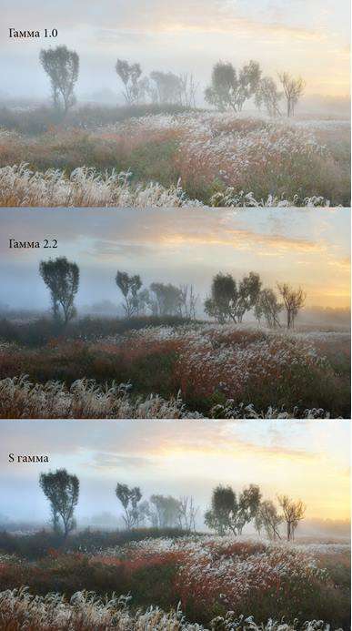 Во всех режимах в тенях значение гаммы близко к идеальному, но с осветлением изображения гамма становится все меньше и меньше. В режимах с S-гаммой, ее значение в светлых участках кадра вообще выходит за границы графика. Что это означает, мы показали на фотографии с туманом на поле: светлые полутона просто исчезают.