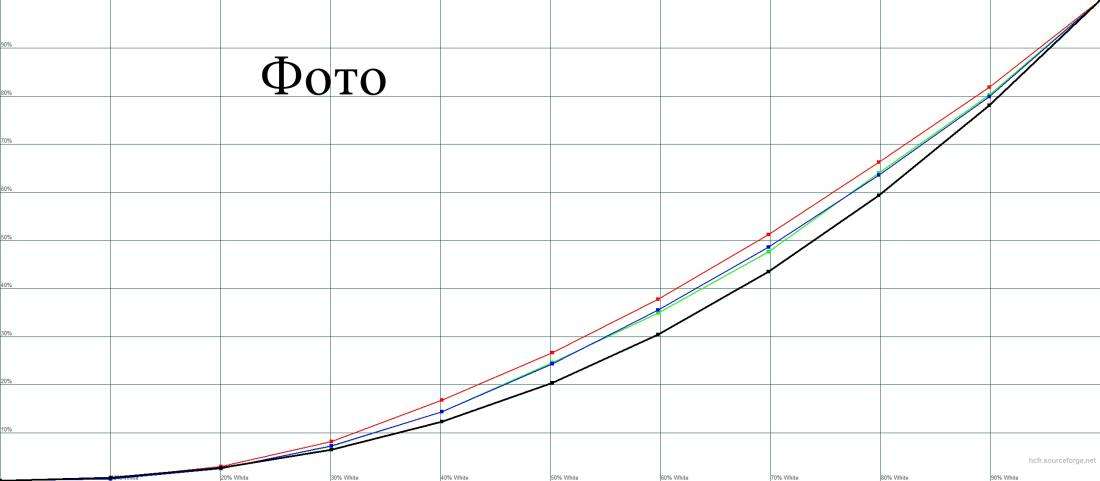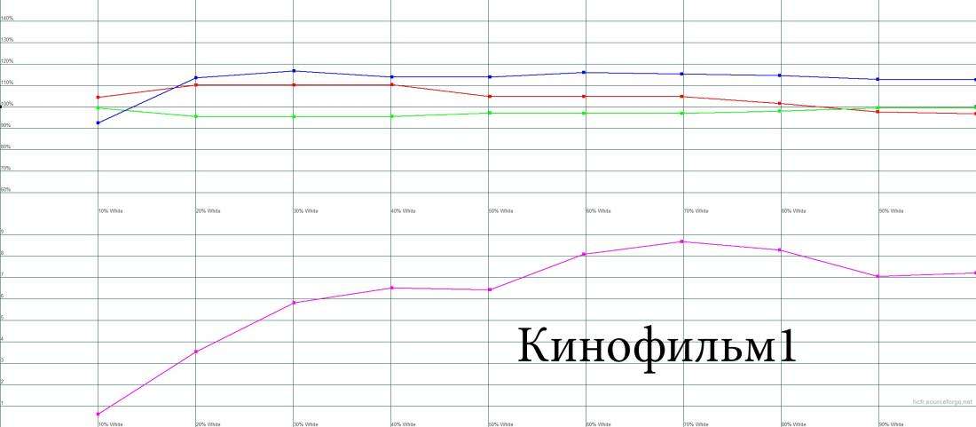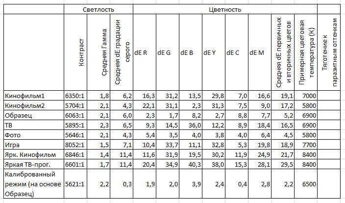Режимы Фото и Кинофильм1 отличаются цветовым охватом. Режимы Образец и Фото – по цветовой температуре, а режимы ТВ и Кинофильм1, не считая небольшой разницы в охвате, отличаются между собой формой гамма кривой.