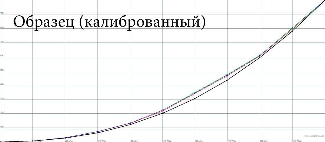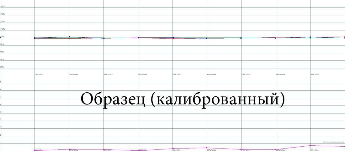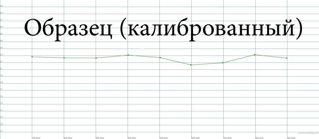 Даже после калибровки не удалось добиться идеальной гаммы на всем промежутке от теней до светлых тонов. Небольшой провал в графике на уровне от 50% до 80% все равно гораздо лучше, чем происходящее в заводских профилях.
