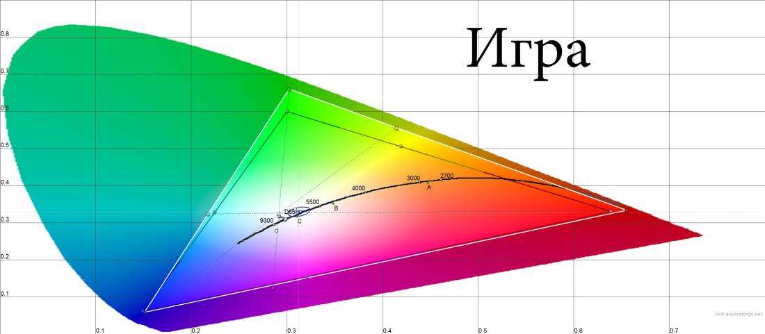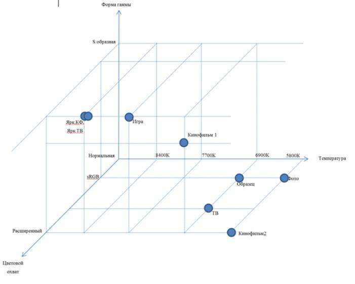 На диаграмме четко видно, что из себя представляет каждый режим. Например «яркие» режимы, Игра и Кинофильм1 - это лишь градация по цветовой температуре.