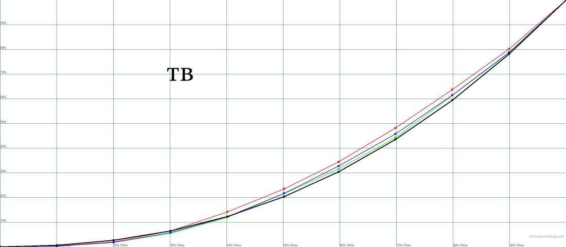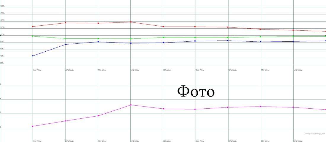 Гамма немного поднимается над референсом (эталонным значением) в средних тонах. зато по светлым и темным краям практически сливается с идеальным значением. Поканальное разложение гаммы также не очень высокое, что указывает на незначительные цветовые отклонения в этих режимах.
