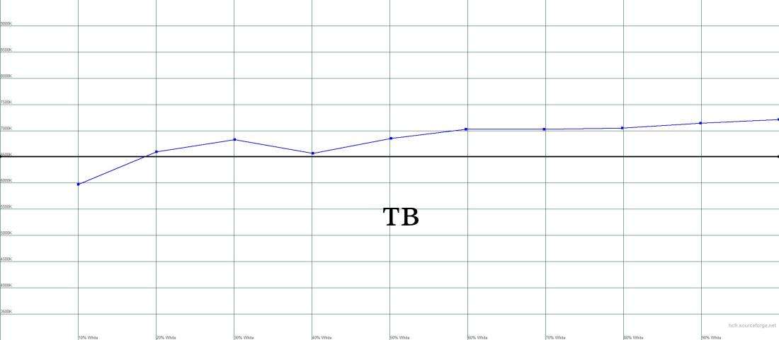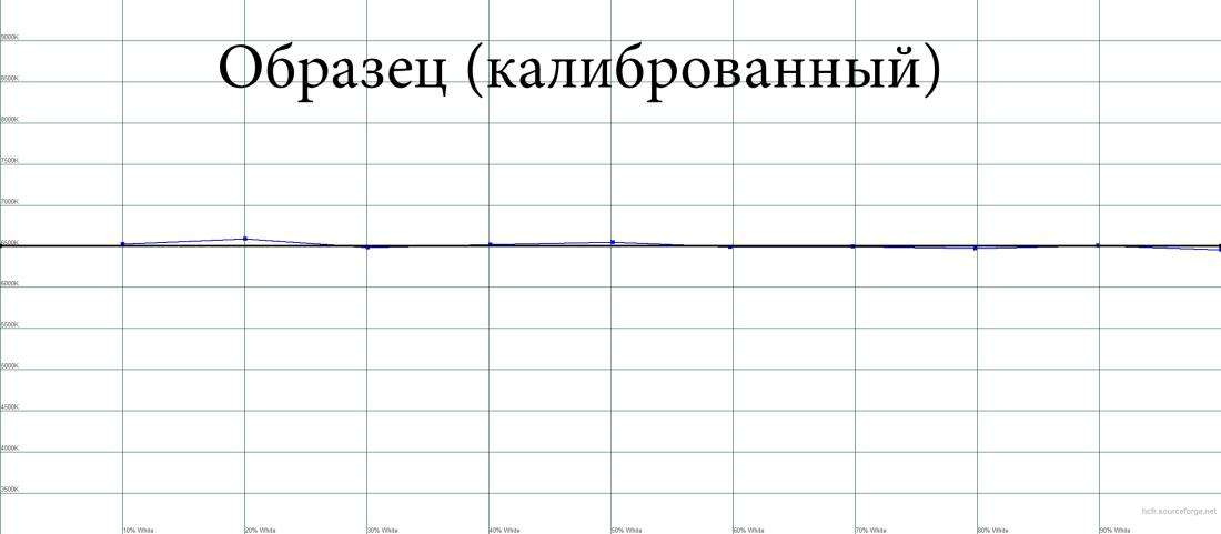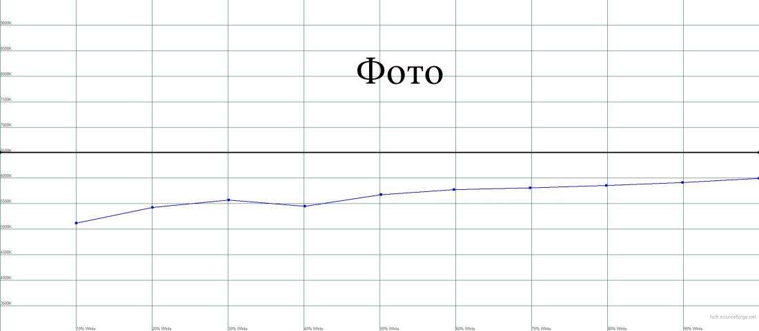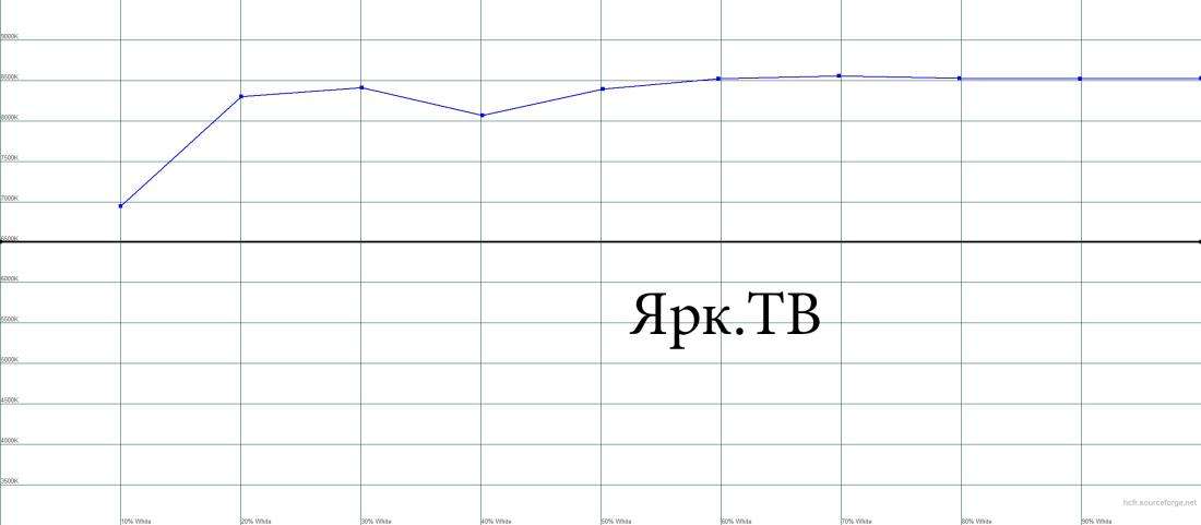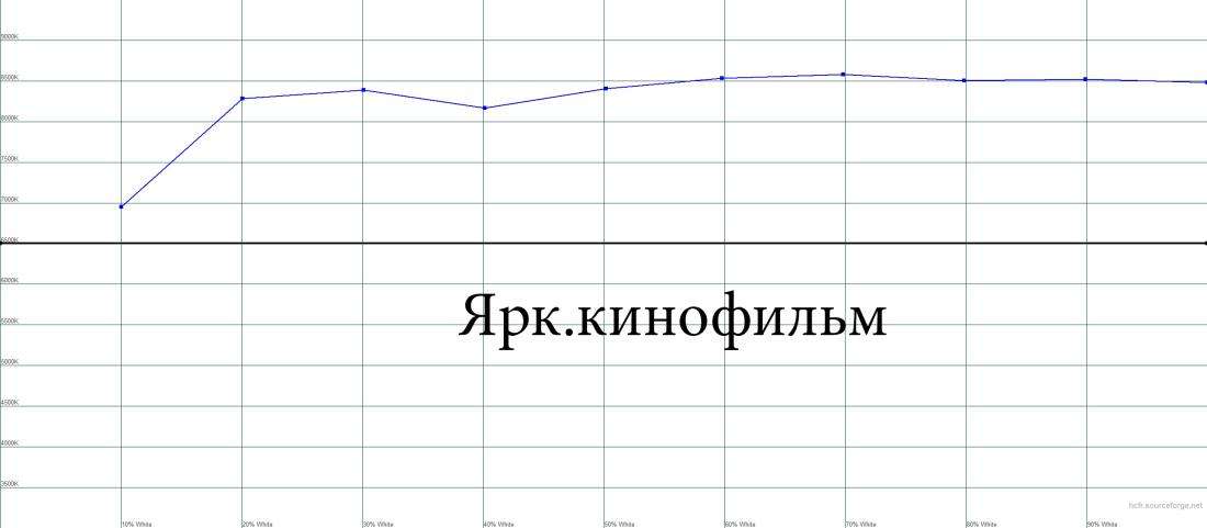 Не правда ли, впечатляет? Все точки серого клина (кроме одной, соответствующей 0% светлости) легли в доверительный интервал dE=3 и ровно по черной кривой. Как следствие, в откалиброванном режиме можно гарантировать стабильную и точную цветовую температуру!