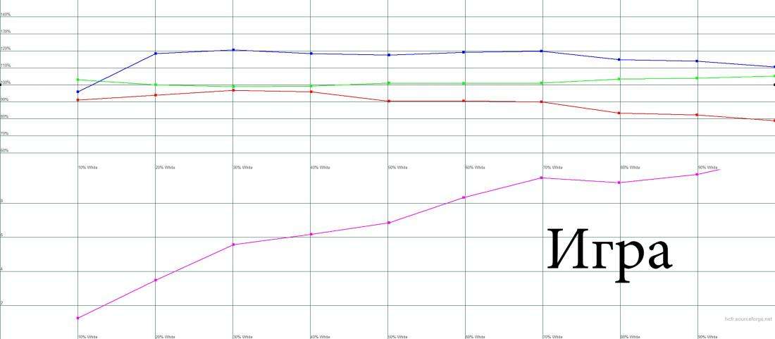 Поскольку эти графики иллюстрируют сдвиг точек серого клина и по кривой и вне ее, то для холодных режимов будет характерен избыточный синий канал, для теплых - красный. За исключением «ярких» режимов и режима Игра, все каналы обладают достаточной стабильностью и изменяются в пределах 10 процентов. Это достаточно хороший, хотя и не идеальный результат.