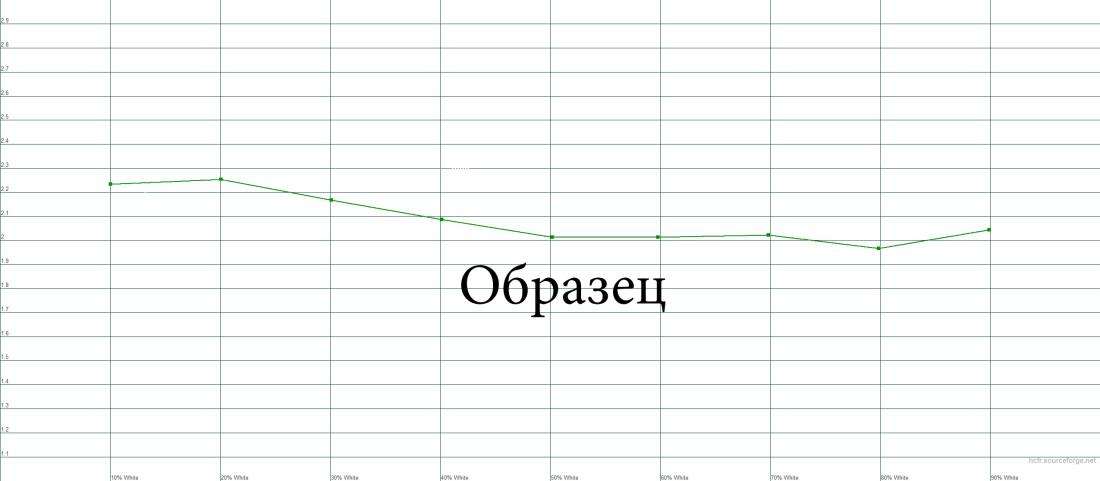 Посмотрим, как изменяется значение гаммы, сформированное вышеописанными кривыми. Хотя идеальное значение гаммы - 2.2, практически все режимы содержат в себе заниженную гамму. Причем, гаммы-кривые некоторых режимов вообще не отличаются. Например, режимы Фото и ТВ имеют абсолютно одинаковую форму графика, разный лишь уровень самой гаммы. А режим Образец и Фото с точки зрения уровня гаммы не отличаются вообще.