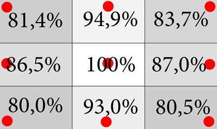 Красными точками на рисунке обозначены места, в которых производились измерения с помощью люксометра. Предварительно на экран было выведено белое изображение 255R, 255G, 255B.