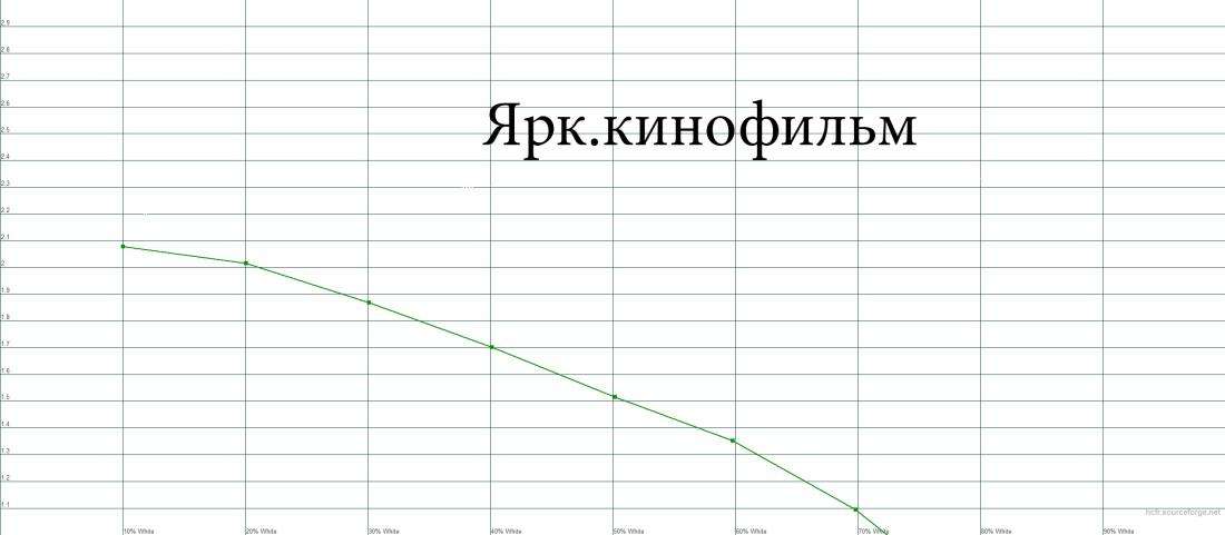 Средние значения гаммы для всех режимов соответствуют их форме: нормальная форма – близкие к стандартным 2.2, режимы с S–кривой имеют завышенное среднее значение, особенно для режима Яркий Кинофильм.