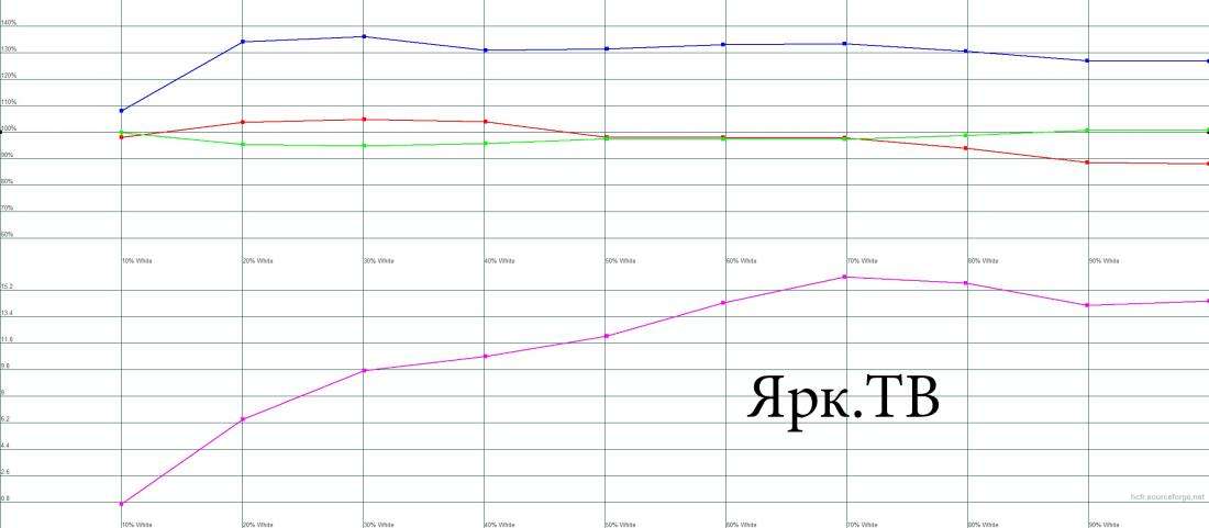 Как и в других замерах, в уровнях RGB некоторые режимы полностью дублируют друг друга. Например Образец и ТВ, Яркий Кинофильм и Яркий ТВ.