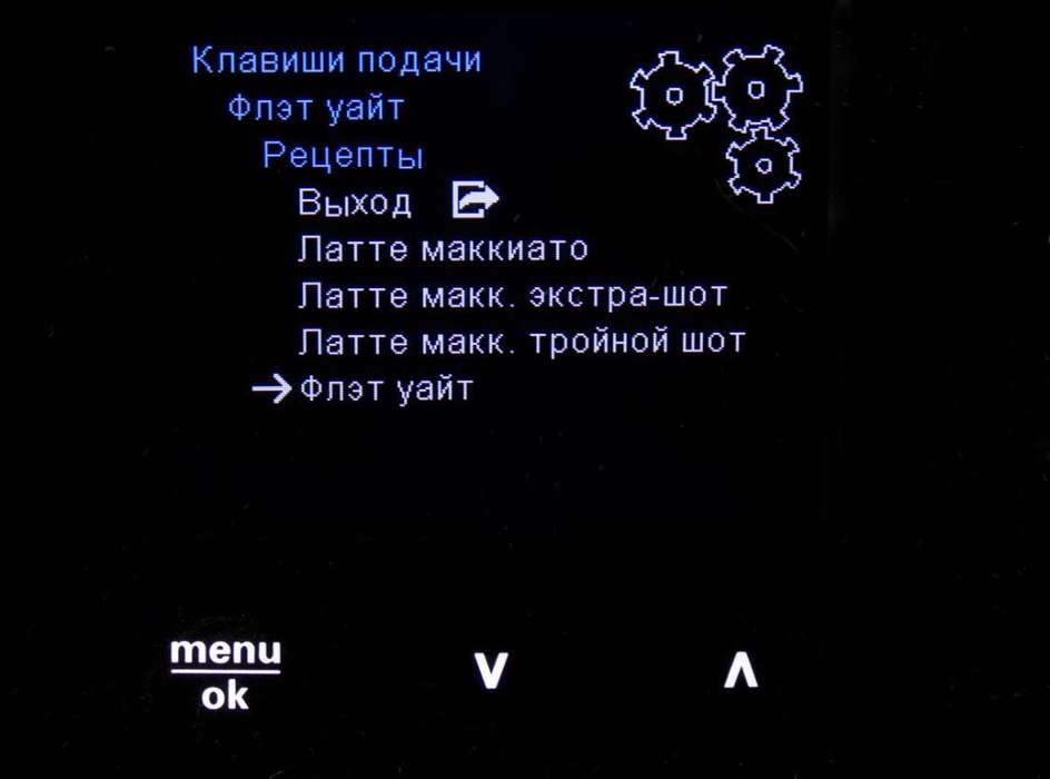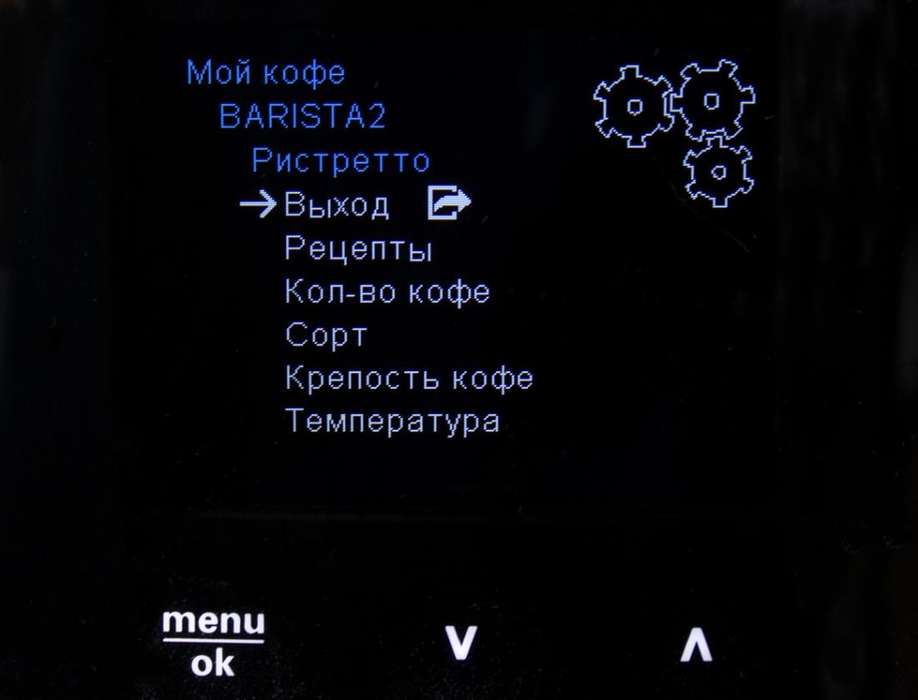 Внутри основного меню рецептов есть подменю, позволяющее выбрать один из 18 кофейных напитков на основе одного из стандартных рецептов. В подменю ЭСПРЕССО входят рецепты ристретто (30 мл), лунго (60 мл), двойного эспрессо (80 мл, тогда как обычный – 40 мл), двойного ристретто (60 мл).