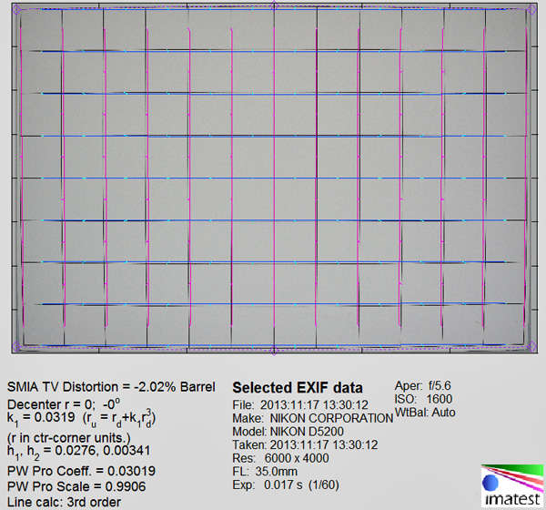 Nikon AF-S Nikkor 35/1.8 G DX выступил чуть хуже ожидаемого: бочкообразная дисторсия составляет 2%, что несколько выше привычного для объективов с аналогичным фокусным расстоянием уровня.