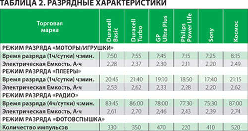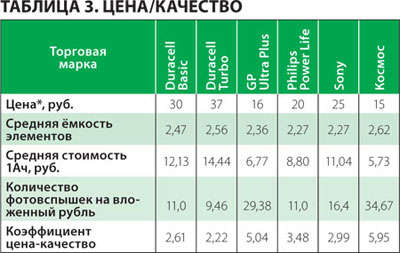Зная время работы элементов питания в разных режимах, можно вычислить электрическую ёмкость этих элементов, измеряемую в Ампер-часах (А-ч). Проще говоря, какой «запас» энергии имеет каждая батарейка. Расчеты показали, что наибольшей средней ёмкостью обладают элементы «Космос» и Duracell Turbo (см. таблицу 3). Немного хуже этот показатель у Philips и Sony (2,27 А-ч).