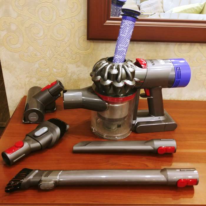 - Dyson V7 Animalpro – помимо основной универсальной насадки с прямым приводом, гибкой щелевой, щелевой и комбинированной насадок комплектуется специальной мини-электрощеткой для уборки мягкой мебели от пыли и шерсти домашних животных. Кроме того, эта модель оснащена усиленной системой фильтрации, позволяющей улавливать мельчайшие частицы и задерживать до 99,97% аллергенов и бактерий размером до 0,3 микрона.