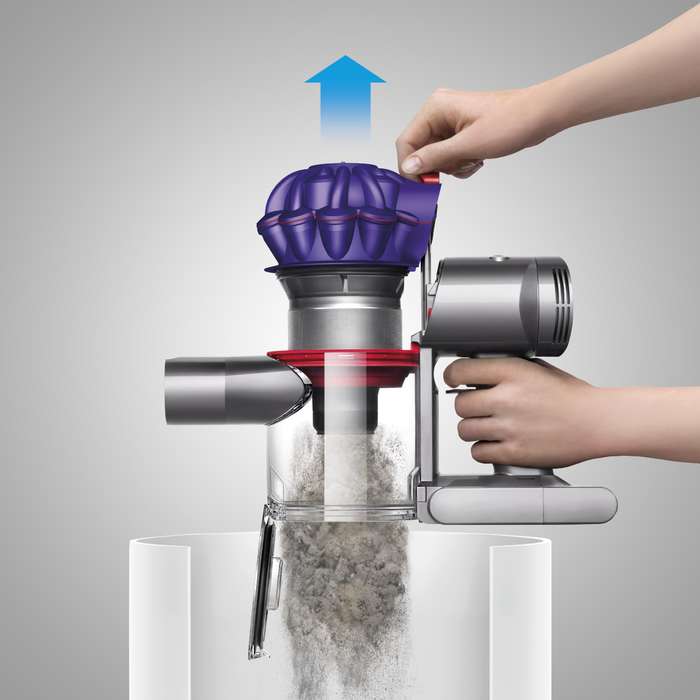 Система освобождения пылесборника от мусора осуществляется одним поднятием рычажка на корпусе. Если вмодели Dyson V6 часть мусора и пыли имела шанс застрять в контейнере, то новая система легкой очистки полностью исключает такую вероятность. Нужно просто держать пылесос над мусорным мешком и тянуть рычаг, колба поднимается и полностью освобождает стакан. Дно контейнера откидывается, и пыль оказывается в мусорном ведре.