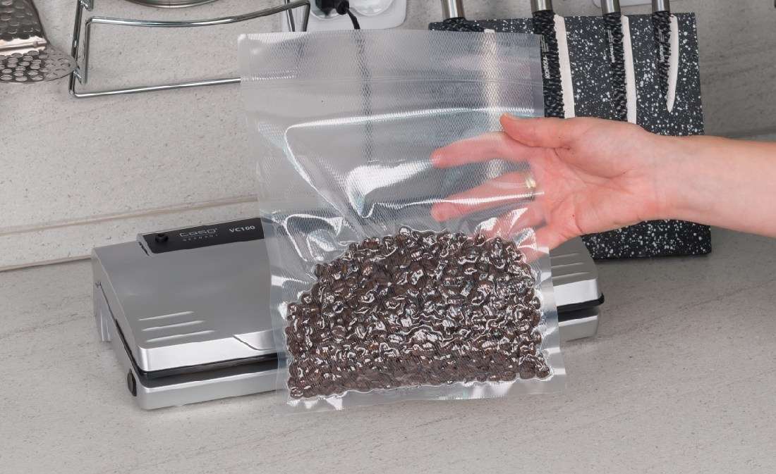 УПАКОВОЧНЫЕ МАТЕРИАЛЫ: специальные пакеты или структурированная пленка шириной до 30 см. Дополнительно: вакуумные контейнеры. CASO на сегодня представляет в России 15 моделей различных пакетов и рулонов по цене комплекта (50 пакетов или 2 рулона) от 530 до 1600 рублей. Пакеты: 20х30 см 50 шт за 840 руб.,23х26 см 50 шт за 1100 руб., 16х23 см 50 шт за 530 руб. Рулоны: 30х600 см, 2 шт за 1400 руб., 28х600 см 2 шт за 1290 руб. Контейнеры: 2990 за набор из 3 контейнеров разного объема.
