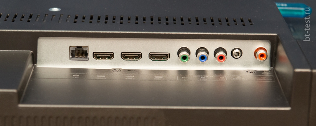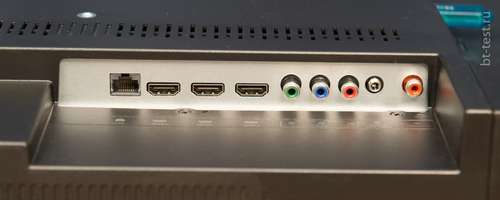 Если включить аппарат, дизайн обогатиться благородным и широким диодом синего цвета, расположенным с левой стороны. Рядом - кнопки управления. Иконки пропечатаны на передней панели, но так, что их почти не видно, и они не портят современный внешний вид телевизора.