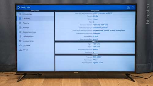 Пора заглянуть «под капот» телевизора Harper 49U750TS. Что мы тут имеем? Довольно мощный процессор - 2x ARM Cortex-A9 с частотой до 1200 мГц. Мощность, правда, не из «формулы 1», но для бюджетных смарт ТВ - на весьма достойном уровне. Картинку на экран выводит графический процессор, оснащенный чипом Mali-400 – он хотя и не самый новый, но зато проверенный временем и весьма надежный. Его потенциала за глаза хватить, чтобы открывать обычные приложения, хотя «промчаться с ветерком» в какой-нибудь современной аркаде с 3D графикой вряд ли получится.