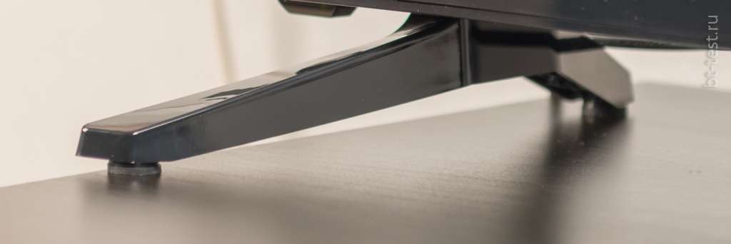 Ножки пластиковые, учитывая прочность пластика и невысокий вес телевизора, такие легкие ножки можно отнести в актив аппарата. К тому же ножки опираются на резиновые пяточки, исключающие скольжению ТВ по поверхности
