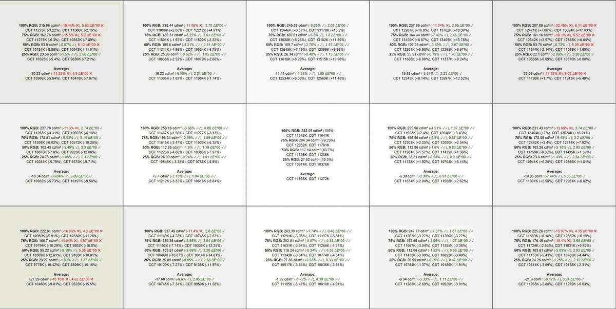 Стабильность цветовой температуры тоже на достойном уровне. Но некоторые перепады замеры выявили: в нижнем левом углу картинка чуть теплее, чем в центре, а в верхнем правом,наоборот, - холоднее. Впрочем, незначительные отклонения в цветовой температуре находятся в том диапазоне, который не виден невооруженному глазу обычному пользователю. Только специальные тестовые отчеты позволяют вскрыть факт подобных перепадов.