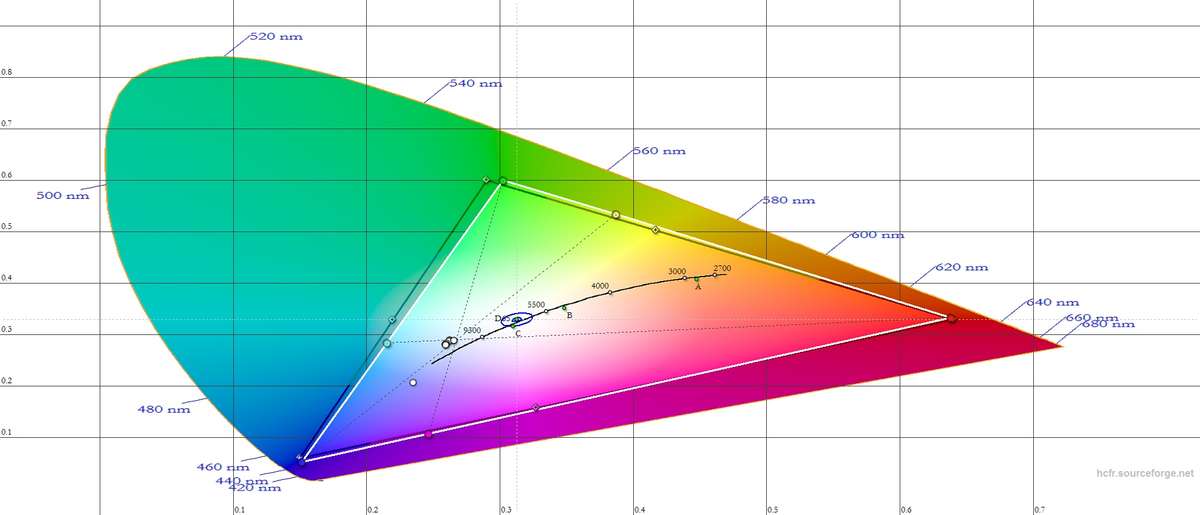 Во всех режимах присутствует крайне холодная цветовая температура порядка 11 000Кпри норме 6500К. Также имеется небольшой голубоватый оттенок. Тем не менее, цветовой охват почти идеальный. Проблема с цветовой температурой явно кроется во вторичных цветах – голубом, желтом и пурпурном, которые находятся не на своих местах. К сожалению, пользователю не дозволено изменять вторичные цвета, более того, нет возможности регулировок даже первичных цветов. Можно подкорректировать только яркость и контраст. На рынке, конечно, найдутся и такие ТВ-приемники, в которых цветовая температуры, вторичные и первичные цвета регулируются, но цена их будет много выше. Думаю, производителю надо просто более точно сделать заводские настройки цветовой температуры.