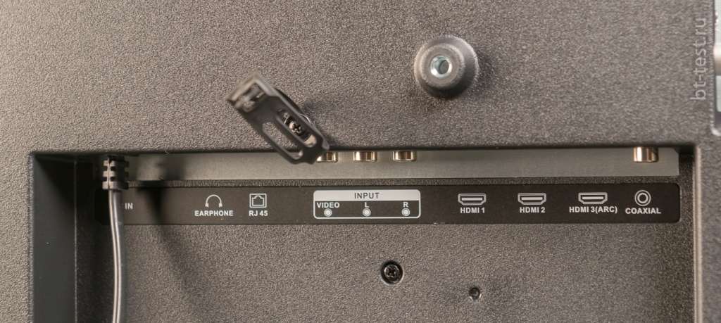 В боковой нише расположены два контакта для USB, CI, композитный вход, VGA, антенный вход и аудиовход 3.5mmjack. В нижней части имеются три разъемаHDMI (один поддерживает ARC), разъем под наушники, LAN, коаксиальныйаудиовыход и компонентный вход колокольчиками.