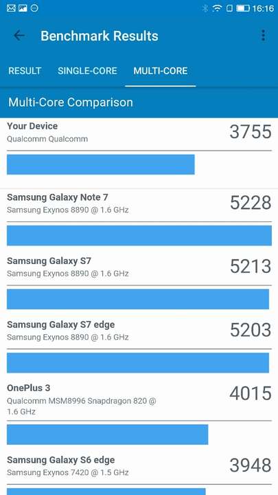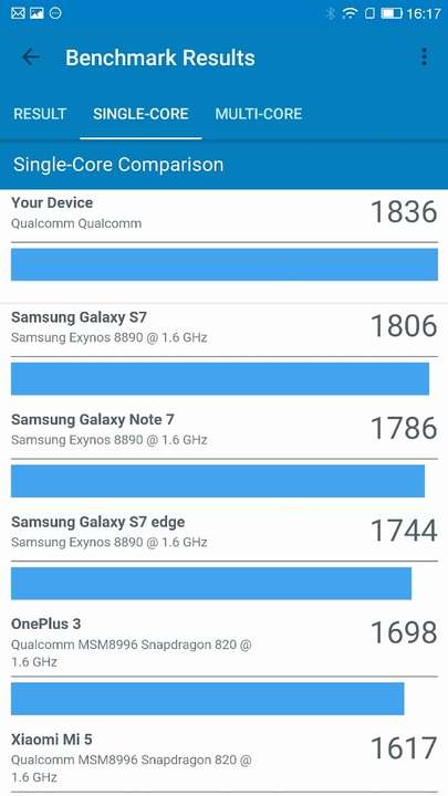 Еще один тестовый пакет – Geekbench. Общие итоги у Le Pro3таковы: одноядерный режим – 1836, многоядерный – 3755. Расклад по конкурентам такой:Le Pro3 стал самым мощным смартфоном в этой категории, оставив немного позади SamsungGalaxys7. Однако, в мультизадачном режиме GalaxyS7 существенно обходит Le Pro3, показывая примерно 5200. Но стоит учитывать два факта: цена этих смартфонов несопоставима, так или иначе Le, но Le Pro3 в топе самых мощных девайсов.