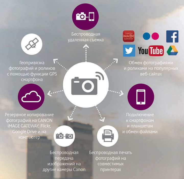 Беспроводная связь Wi-Fi позволяет соединяться с внешними устройствами, как напрямую, так и через внешнюю точку доступа. Для совместной работы камеры с мобильными устройствами на них необходимо предварительно установить приложение CameraWindow. Оно позволит скачивать снимки из камеры в телефон, а также использовать его в качестве пульта ДУ при съемке.