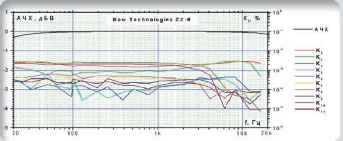 Спад АЧХ в басе начинается с 40-50 Гц (–0,1 дБ при 20 Гц), в ВЧ с 7-8 кГц (–0,1 дБ при 20 кГц). Коэффициент гармоник (THD) на частоте 1кГц равен 0,005%. Вторая гармоника довольно равномерна и вносит наибольший вклад в THD. Минимальный (<0,001%) и примерно равный вклад вносят третья и сумма старших нечетных гармоник. Наименее равномерна сумма старших нечетных гармоник, она дает второй по величине вклад в THD в басе и середине.