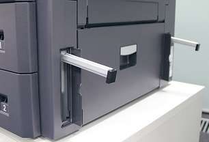 Чтобы открыть кассету с бумагой, следует слегка надавить на её ручку. «Плюс» такого решения — конструкция исключает случайное выдвижение кассет при использовании или их «вылетание» при транспортировке устройства. «Минус» — часть пользователей будет пытаться «выдернуть» лоток из аппарата без нажатия, ломая внутренние держатели.