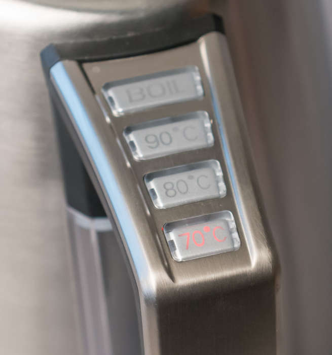 Очень простой в управлении прибор. Единственный в тесте с панелью управления на ручке. Всего 4 кнопки — три с температурой и одна со знаком кипячения. Наливаете в чайник воду, нажимаете на нужную кнопку — и процесс пошел. Кнопки оснащены световой индикацией. При выборе она начинает мигать.