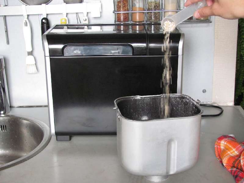 Теперь отруби, мак и семечки. Затем делаю углубление в муке и засыпаю в него сухие дрожжи. Закладка заняла не более 10 минут. Ставлю ведерко в печку и делаю настройки, выбираю режим «Русский пекарь», буханка средняя, корочка темная. Нажимаю на кнопку «Старт» – и все, прибор приступает к работе.