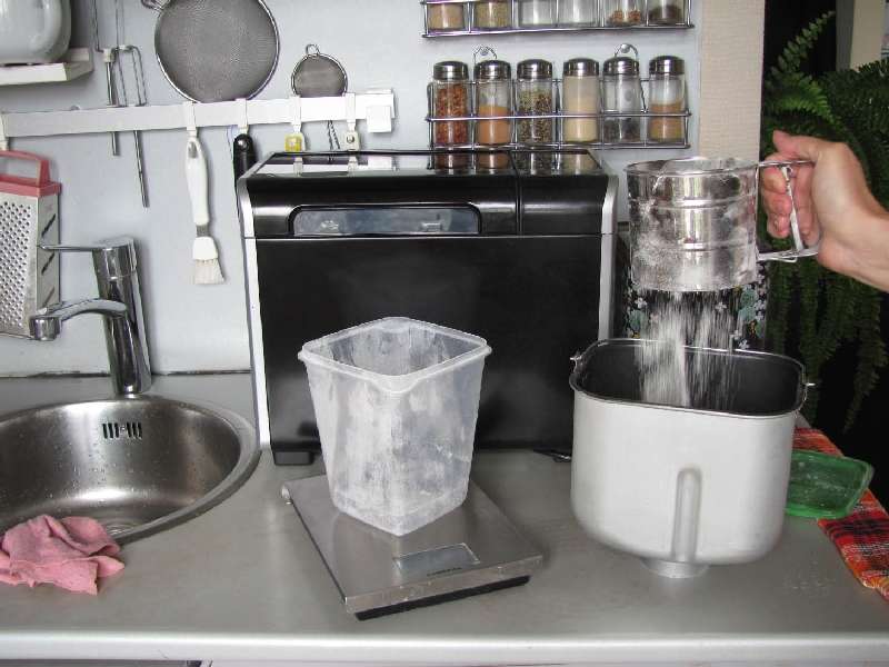 В ведерко заливаю необходимое количество воды, добавляю подсолнечное масло. Отмеряю (при помощи весов) и просеиваю прямо в ведерко муку, кладу сухое молоко, соль и вместо сахара мед – он придаст хлебу интересную ароматную нотку.