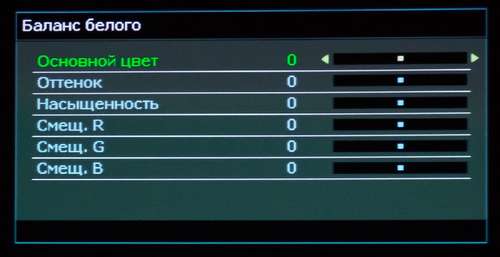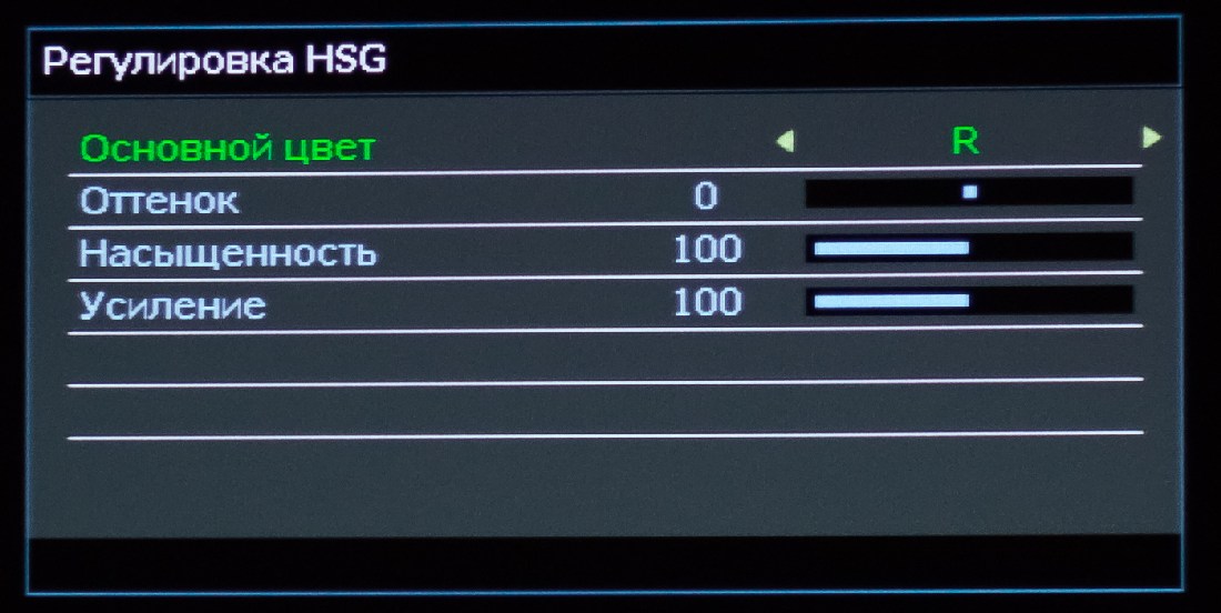 Но основная магия Vivitek скрывалась в разделе регулировка HSG. Это полноценная система управления цветом, причем, по шести осям — R/G/B/C/Y/M, с возможностью регулировки оттенков, насыщенности и яркости. В руках профессионального калибратора такой набор — убойный инструмент по борьбе с несовершенной цветопередачей.